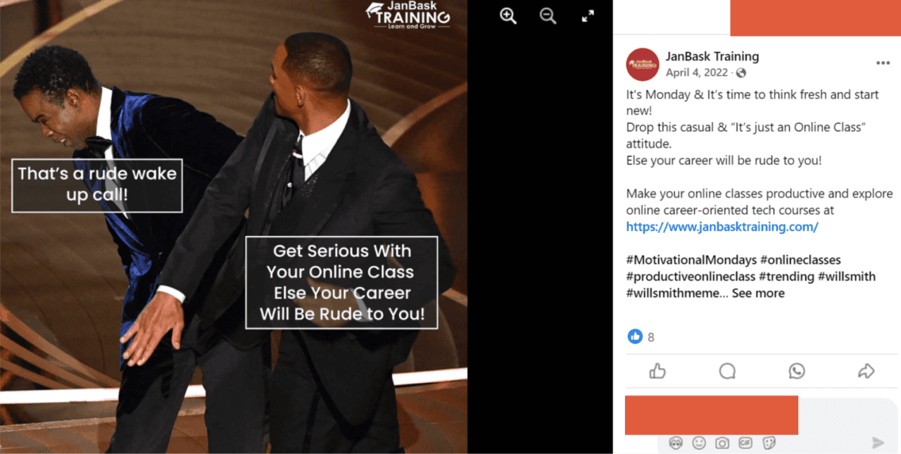 2) Content strategy: Introduced viral memes to drive the narrative. JanBask Training is an educational company. Educational posts can sometimes be boring. To make things a little catchy, implemented memes can create humor and drive engagement. At that time, the Oscars incident between Will Smith and Chris Rock was viral. It sat perfectly with the post theme, which was about taking online classes seriously.