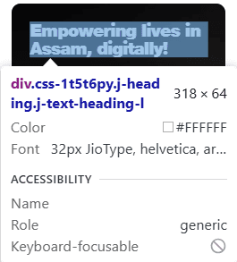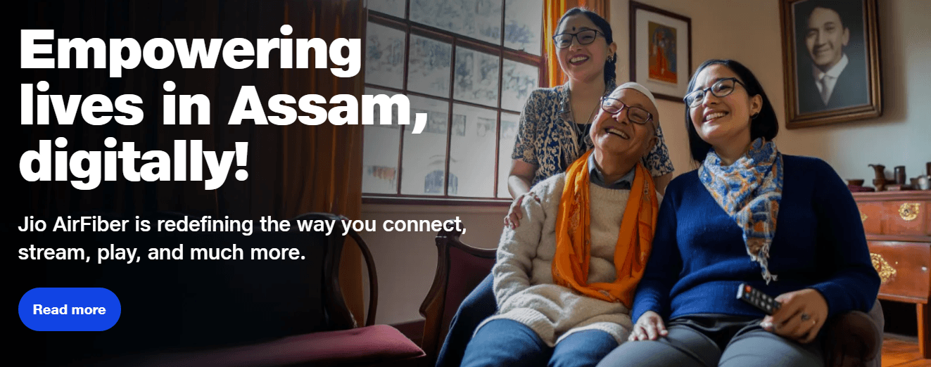 Landing page content revamp: New banner headline: “Empowering lives in Assam, digitally!” Clear sub-text: "Jio AirFiber is redefining the way you connect, stream, play, and much more." Sectional heading: Helping India evolve digitally! Sub-text: Insights on how Jio is shaping futures with digital empowerment.