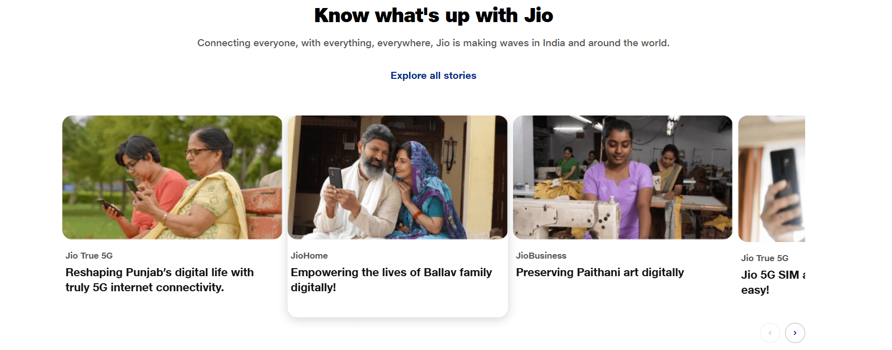 Landing page entry point: Incorporated a separate section about Jio stories on the home page with an apt heading, sub-text, and 'Explore all stories' CTA.
